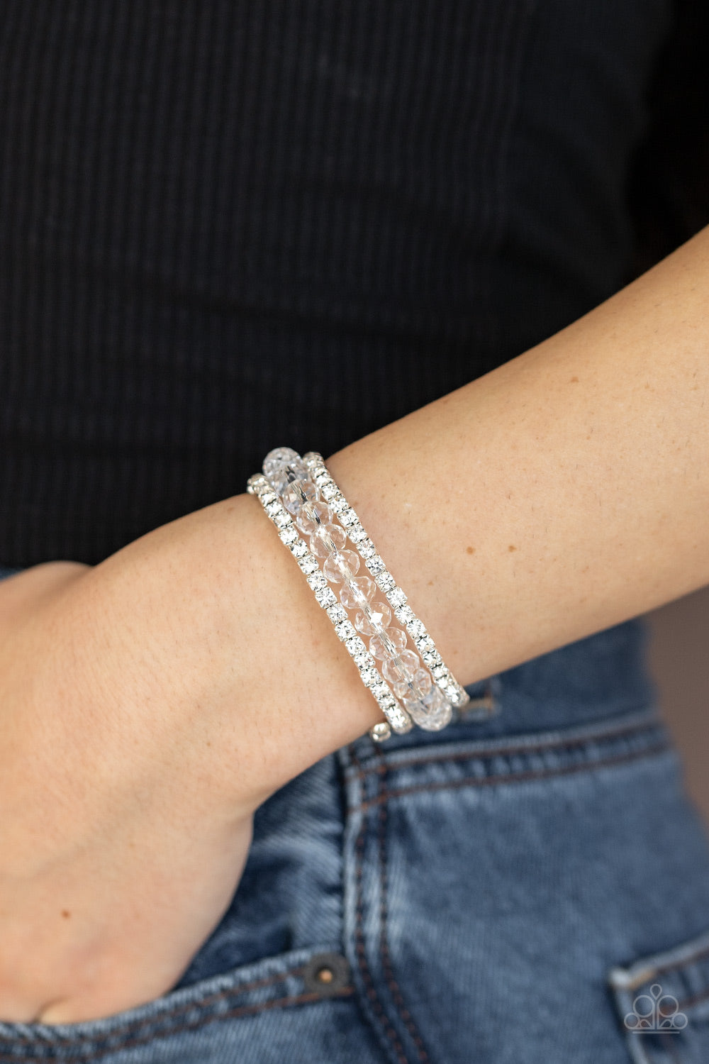 A dazzling collection of glassy white rhinestones and glittery white crystal-like beads are threaded along a coiled wire, creating a blinding infinity wrap style bracelet around the wrist.