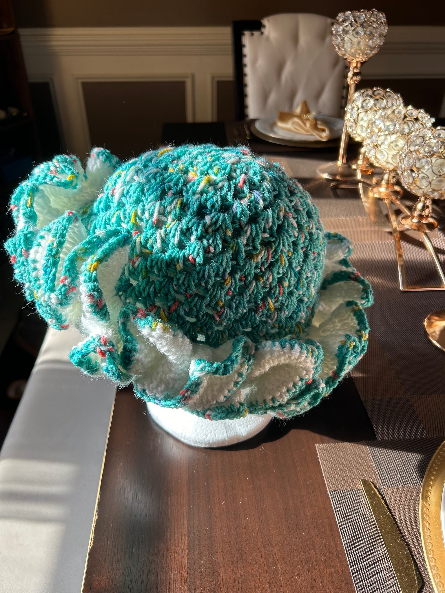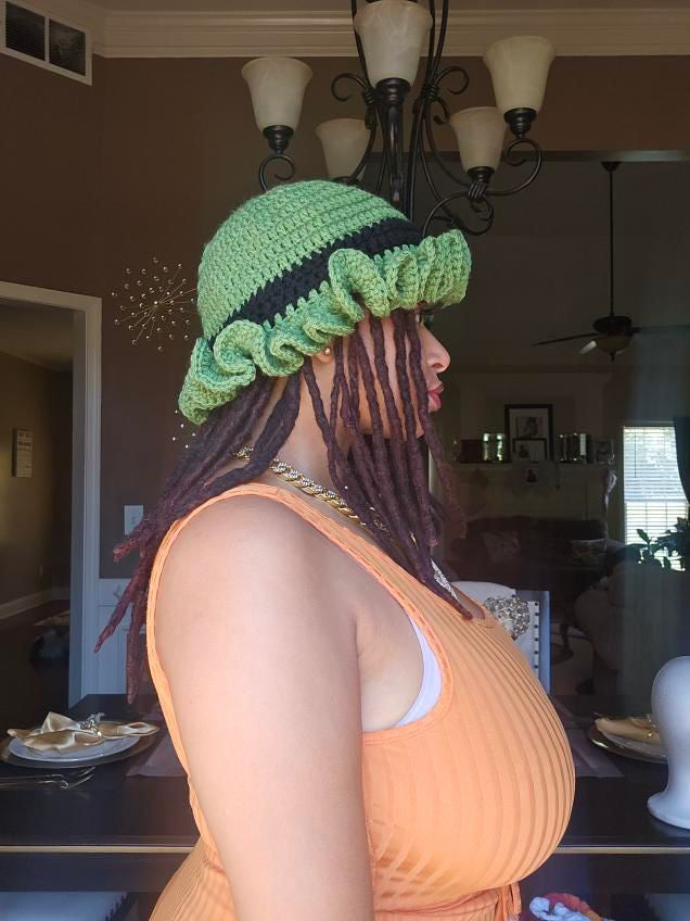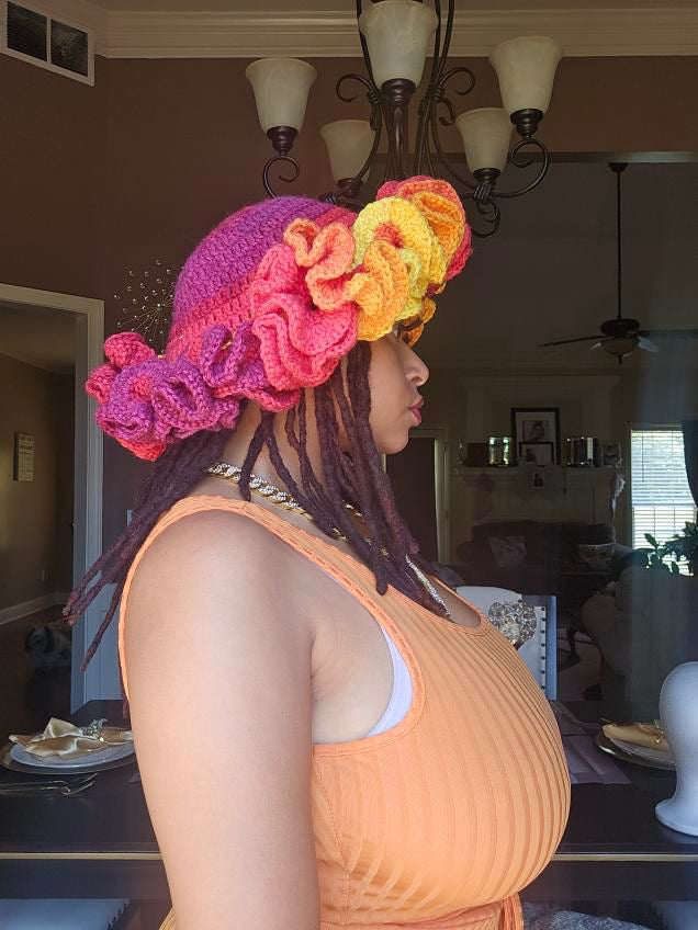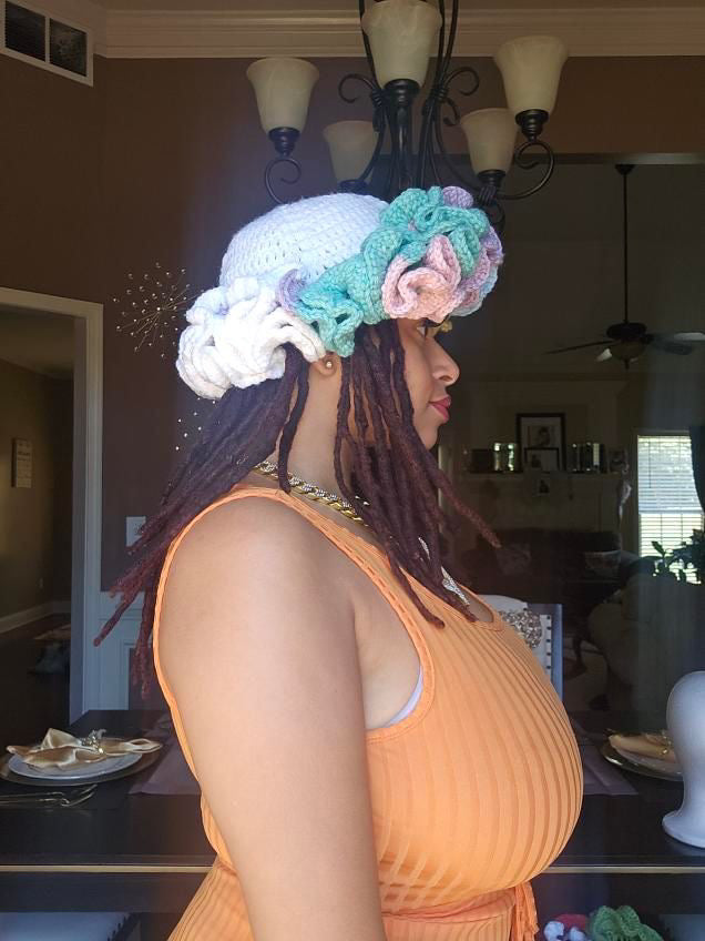 Bucket hats with two rolls of ruffles for children or three rolls of riffles for adults. Please give 14-21 business days for shipping. Hats are made when purchased.